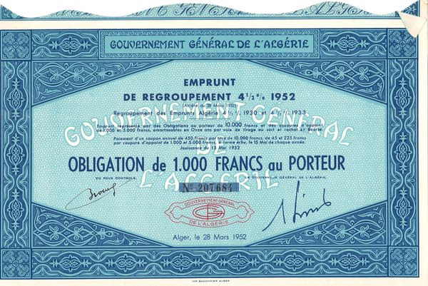 Gvt Gale de l'Algérie - Emprunt 4% 1952 (Obl 1000 F)