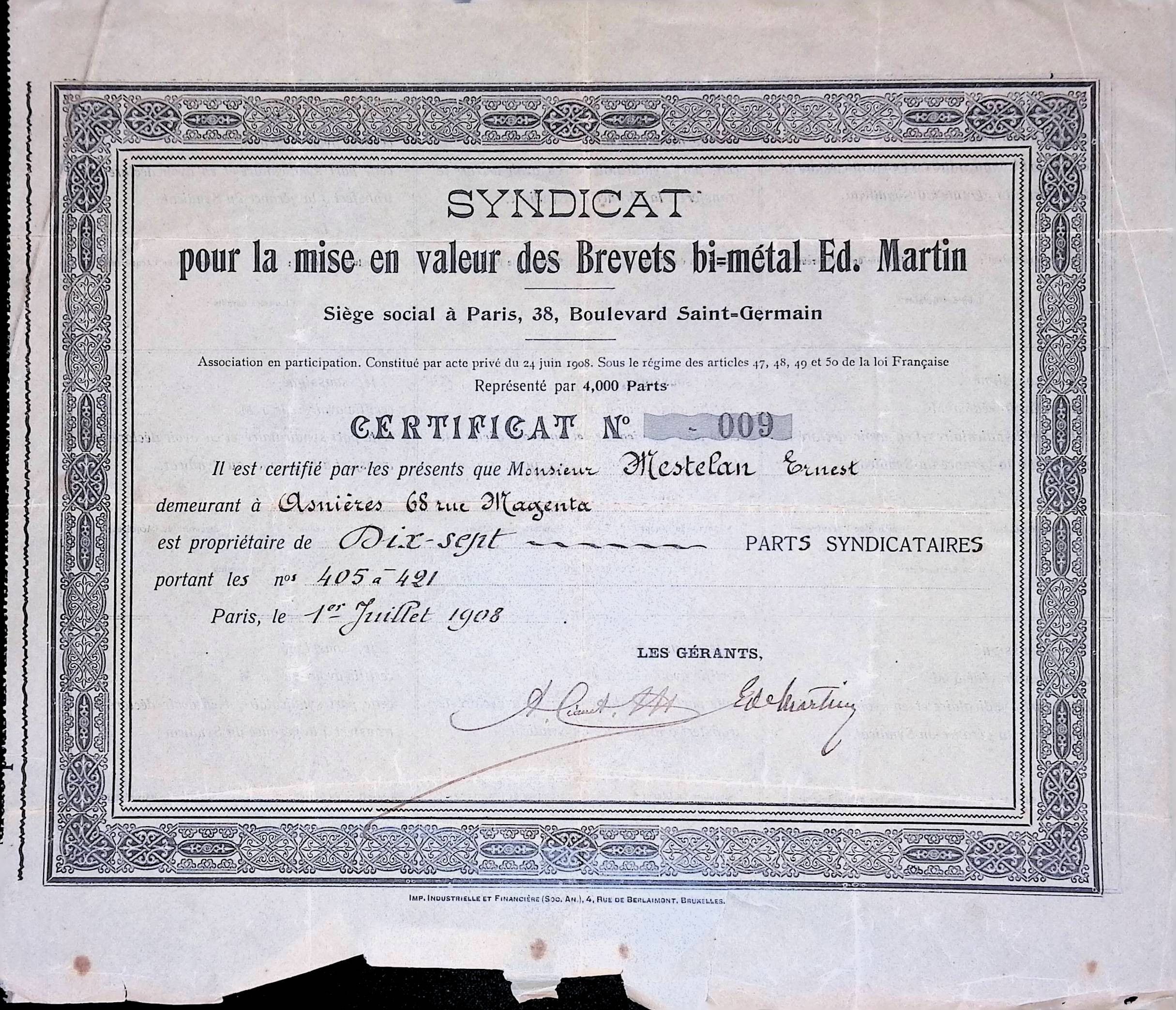Syndicat pour la Mise en Valeur des Brevets Bi-métal Ed. Martin