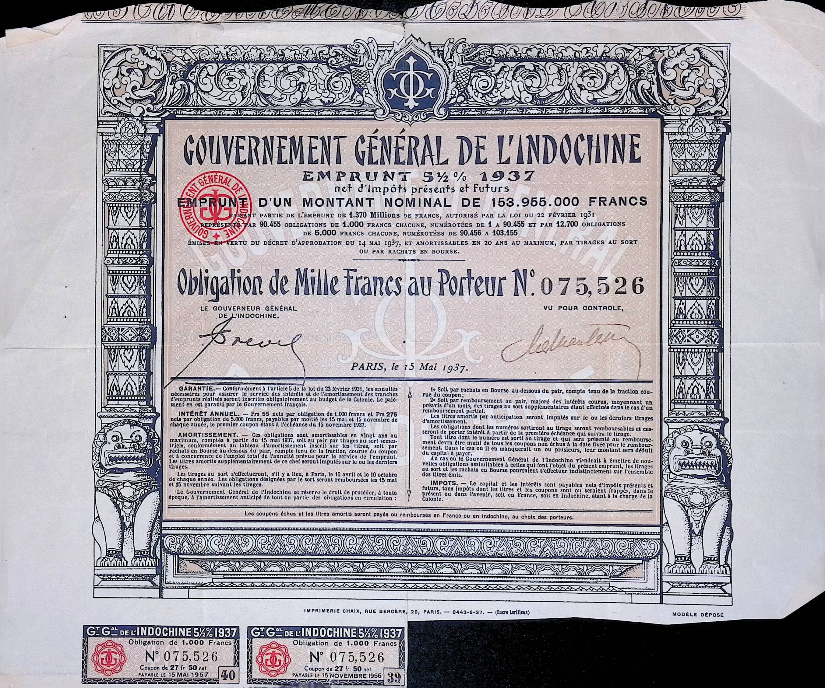 Gvt Général de l'Indochine - Emprunt 5,5% 1937 - 1000F