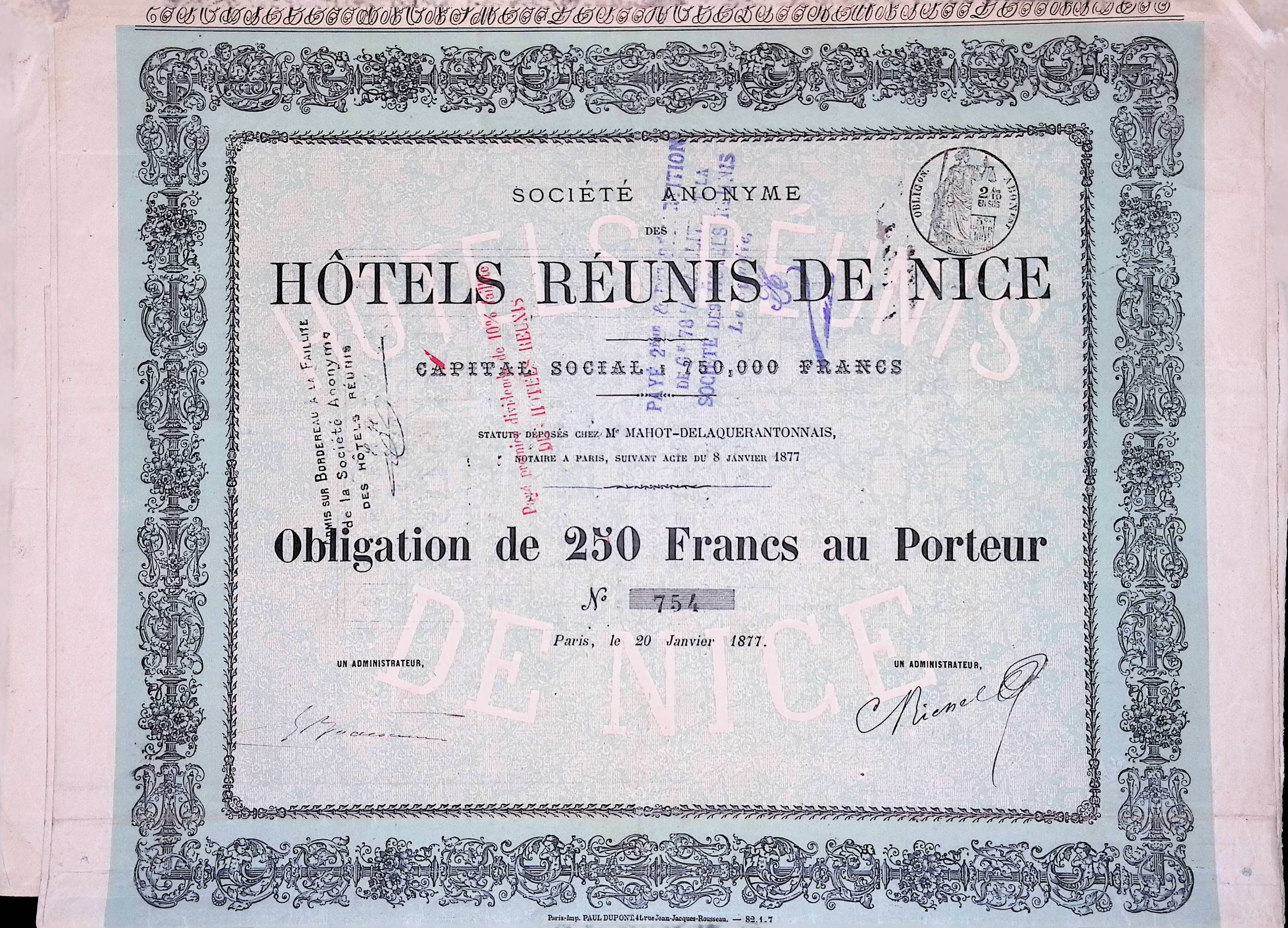 S.A des Hôtels Réunis de Nicen (Obl 250F)