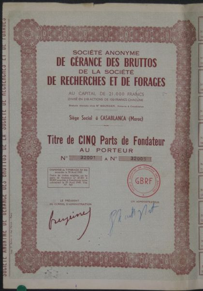 S.A. de Gérance des Bruttos de la Sté de Recherches et de Forages (5 Parts)