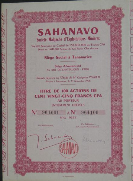 Sahanavo Sté Malgache d'Exploitations Minières (100 Ac)
