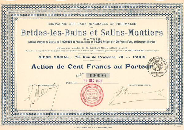 Cie des Eaux Minérales et Thermales de Brides-les-Bains et Salins-Moutiers (Act 100 F) (modèle 2)