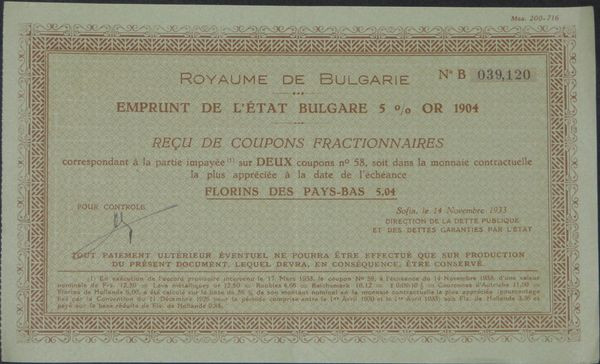 Emprunt de l'Etat Bulgare 5 % Or 1904 (reçu)