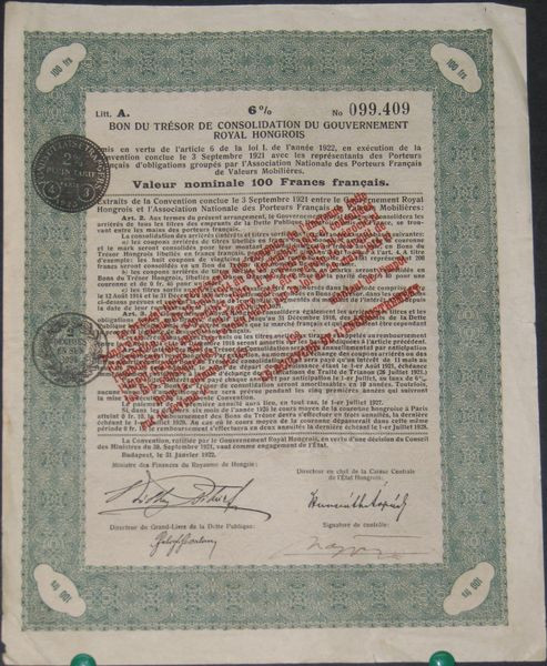 Bon du Trésor de Consolidation du Gvt Royal Hongrois 6 % (100 FF)
