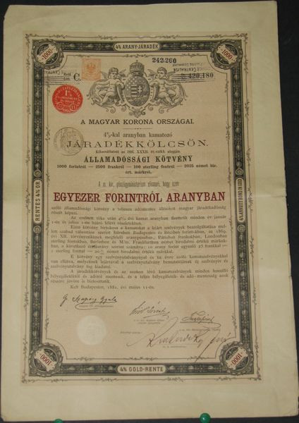 Emprunt 4 % du Royaume de Hongrie payable en Or (1000 forintos)