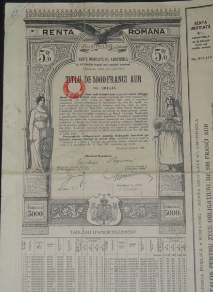 Datoria Publica a Romaniei - Renta Unificata 5 % Amortibila (5000 Franci Aur)