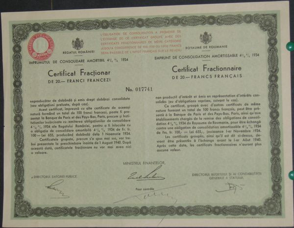 Royaume de Roumanie - Emprunt de Consolidation amortissable 4 1/2 % 1934 (20 F)