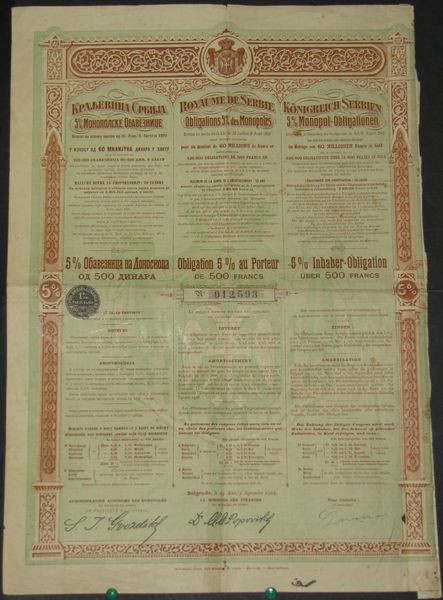 Royaume de Serbie - Obligations 5 % des Monopoles