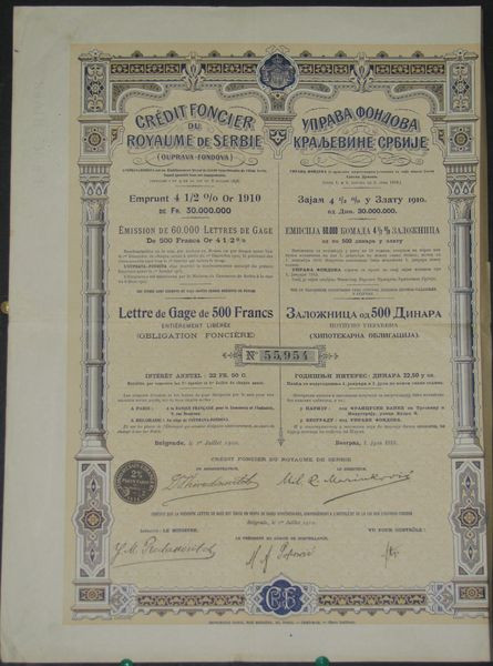 Crédit Foncier du Royaume de Serbie - Emprunt 4 1/2 % Or 1910