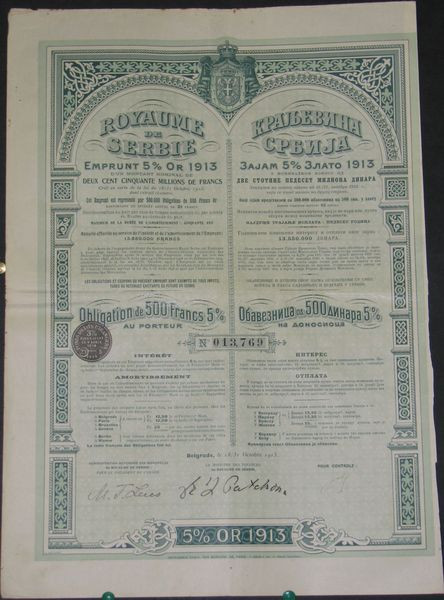 Royaume de Serbie - Emprunt 5 % Or 1913