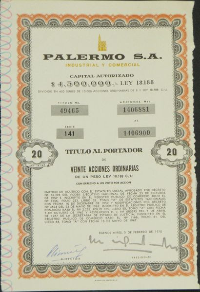 Palermo S.A. - Industrial y Comercial (20 Pesos - 1970)