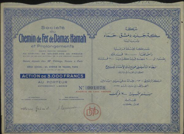 Sté du Chemin de Fer de Damas-Hamah et Prolongements (bleue)