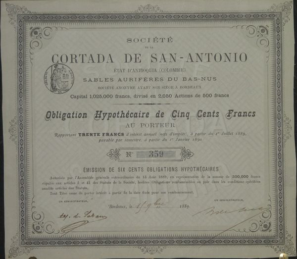 Sté de la Cortada de San-Antonio - Etat d'Antioquia (Colombie) - Sables Aurifères du Bas-Nus