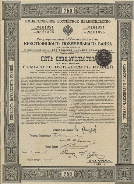 Certif d'Etat 4 1/2 % de la Banque Foncière Russe des Paysans - 750 Rbl