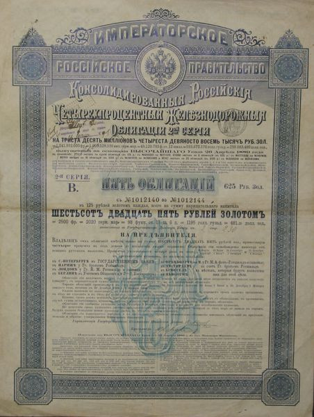 Obl Consolidées Russes 4 % des Chemins de Fer - 2° série B - 625 Rbl Or