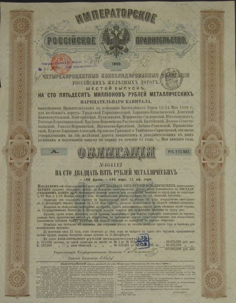 Obl Consolidées Russes des Chemins de Fer Russes - 1880 - 125 Rbl Met - 4 % - 6ème Emission