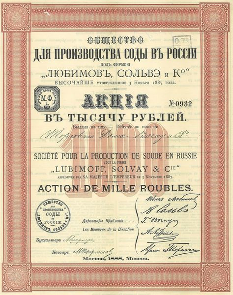 Sté pour la Production de Soude en Russie sous la firme "Lubimoff Solvay et Cie" - 1888