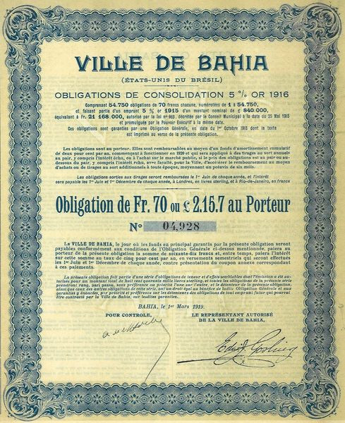 Ville de Bahia - Obligations de Consolidation 5 % Or 1916 (Obl 70 Fr)