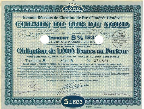 Grands réseaux de Chemins de Fer d'Intérêt Général - Chemin de Fer du Nord 5% - 1933 - (Verte)(Obl 1000 F 5%)