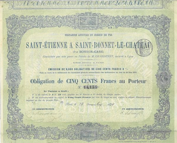 Cie Anonyme du Chemin de Fer de Saint-Etienne à Saint-Bonnet-le-Château 1874 (Emission 6000)