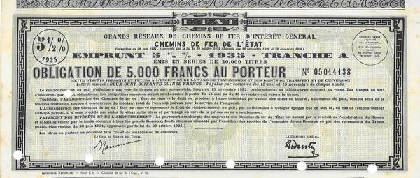 Grands Réseaux de Chemins de Fer d'Intérêt Général - Chemins de Fer de l'Etat - Emprunt 5 1/2 % 1935 Tranche A