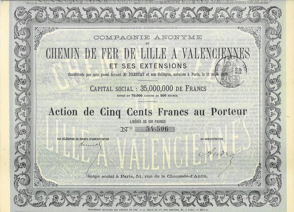 Cie Anonyme du Chemin de Fer de Lille à Valenciennes et ses Extensions (Act 500 F)(verte)