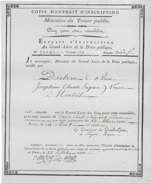 Trésor Public - Extrait d'Inscription du Grand Livre de la Dette Publique (360 F)