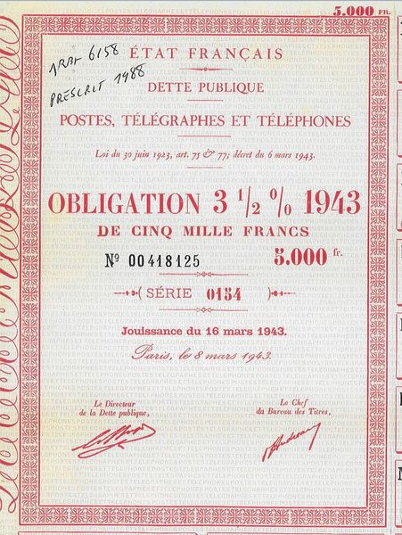 Dette Publique Postes Télégraphes et Téléphones - Obligation 3.5 % 1943 de 5000 F