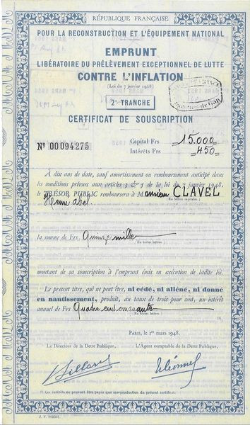 Pour la Reconstruction et l'Equipement National - Emprunt Libératoire du Prélèvement Exceptionnel de Lutte contre l'Inflation -
