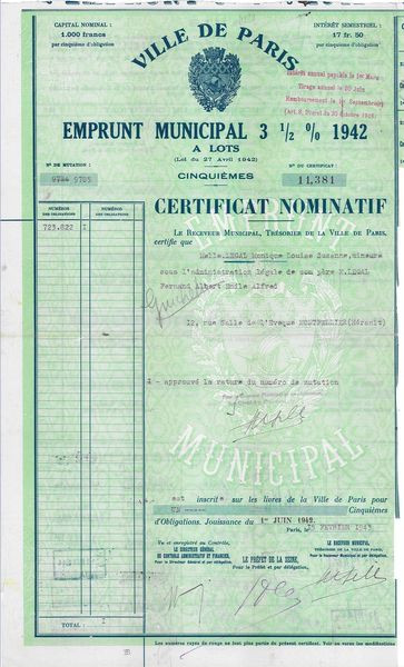 Ville de Paris Emprunt Municipal 3.5 % à lots 1942