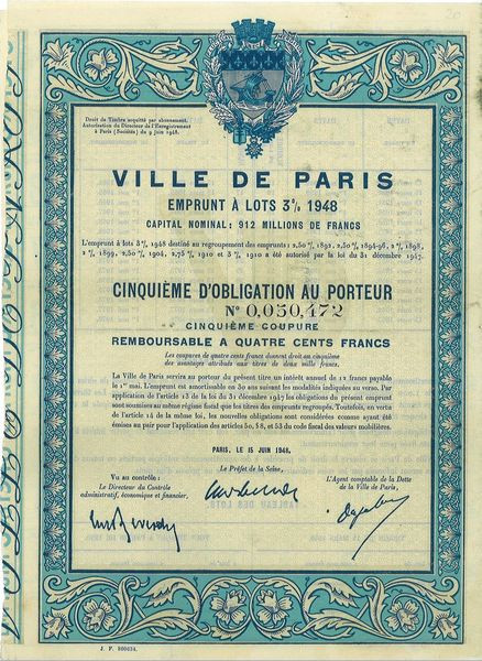 Ville de Paris Emprunt à lots 3 % 1948 - 1/5ème d'Obl