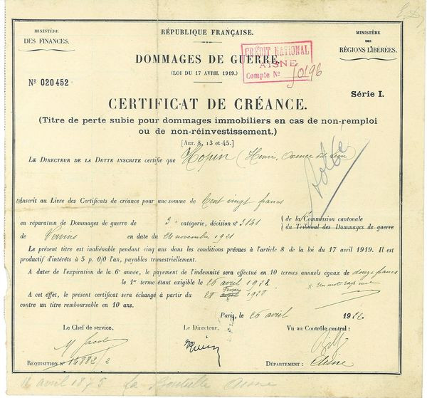 Dommages de Guerre (Titre de perte subie pour dommages immobiliers en cas de non-remploi ou de non-réinvestissement)