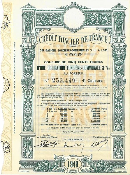 Crédit Foncier de France Obligations Foncières Communales 3% à lots 1949 (500 F)