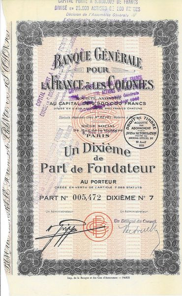 Banque Générale pour la France et les Colonies (1/10ème PF)
