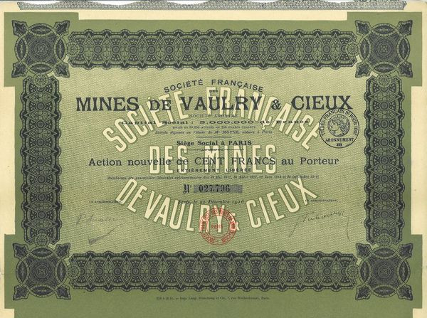 Société Française des Mines de Vaulry & Cieux (Act nlle de 100 F)