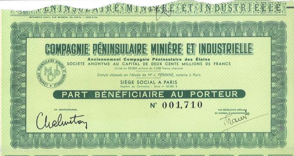 Compagnie Péninsulaire Minière et Industrielle (Anc Compagnie Péninsulaire des Etains) (PB)
