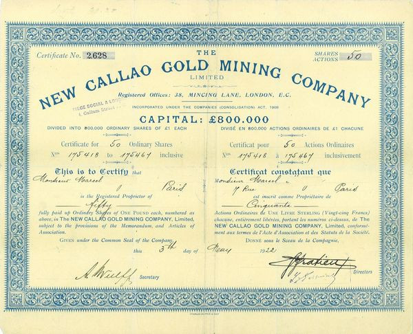 The New Callao Gold Minning Cy Ltd (Certif 50 Ac)