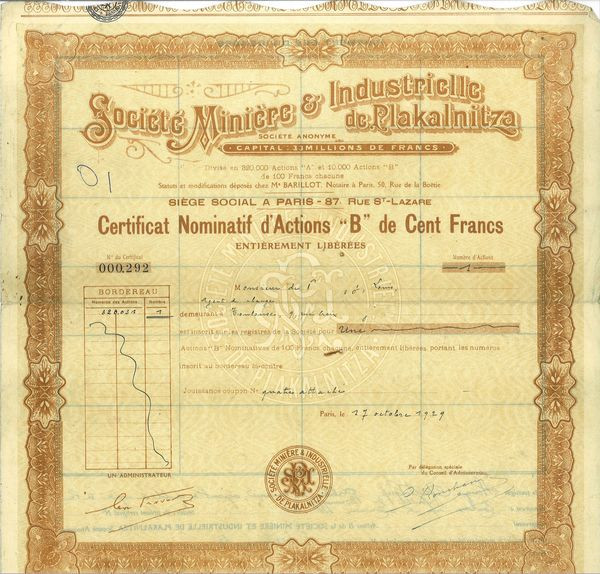 Sté Minière & Industrielle de Plakalnitza (Certif)