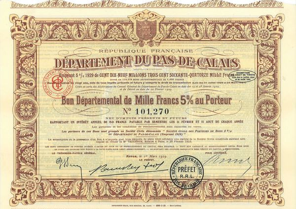 République Française - Département du Pas-de-Calais - emprunt 5% 1929 de 119 374 000 Francs