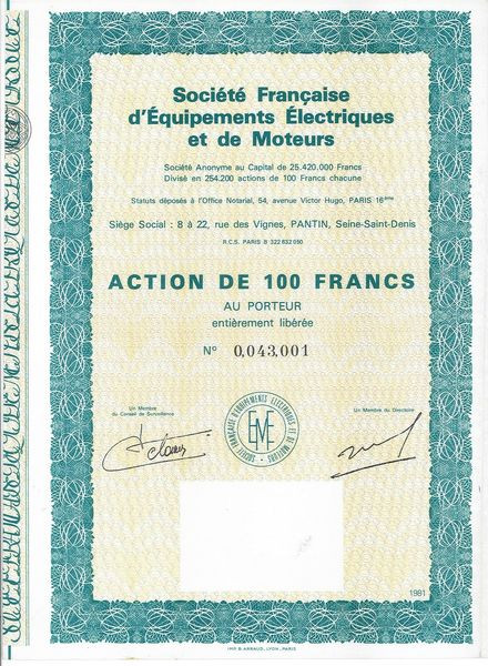 Sté Française d'Equipements Electriques et de Moteurs (Act 100 F)