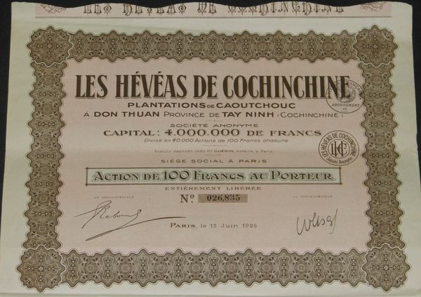 Les Hévéas de Cochinchine - Plantations de Caoutchouc (Act 100 F - capital 4 M)