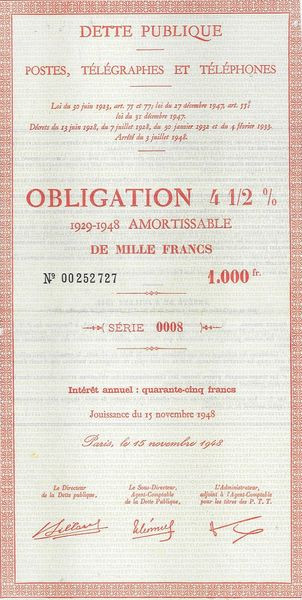 Dette Publique. Postes. Télégraphes et Téléphones - Obl 4 1/2 % 1929-1948 1000 F
