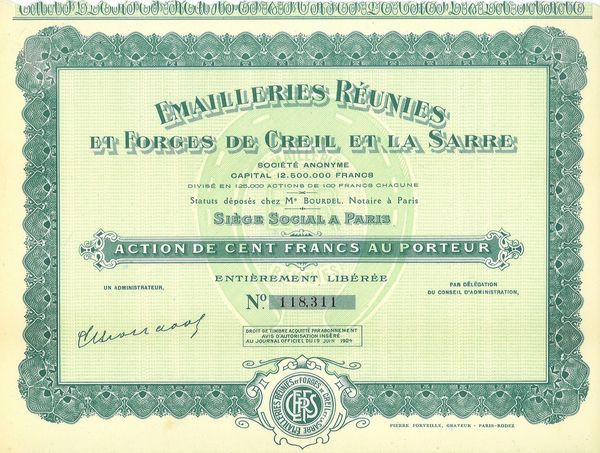 Emailleries Réunies et Forges de Creil et la Sarre (Act 100 F)(1924)