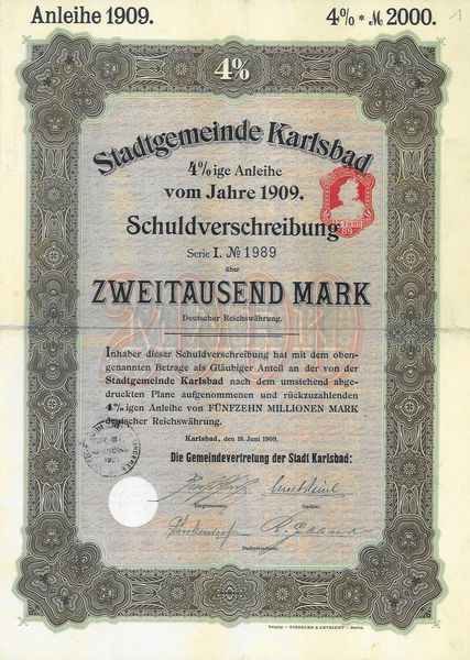 Stadtgemeinde Karlsbad 4% ige Anleihe vom Jahre 1909 (2000 Mark)