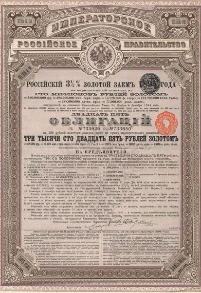 Emprunt Russe 3 1/2 % Or de 1894 - 3125 Rbl Or
