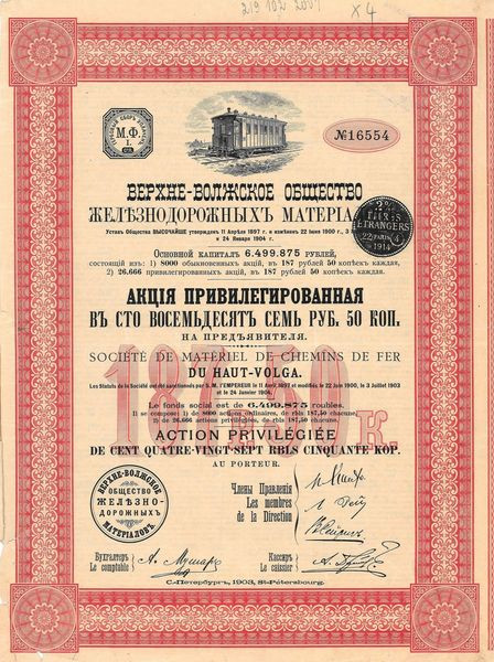 Sté de Matériel de Chemins de Fer du Haut-Volga - Act Privil 187.50 Rbl