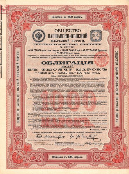 Cie du Chemin de Fer de Varsovie-Vienne - Obl 4 % 1000 Rm - Série 10