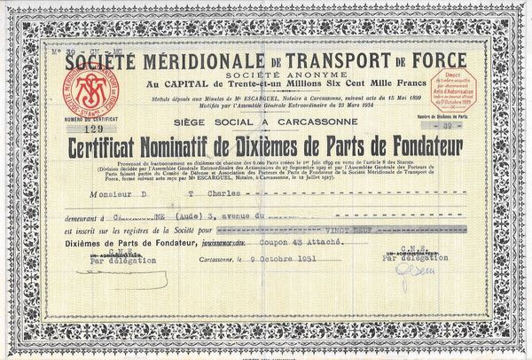 Sté Méridionale de Transport de Force (Certif Nomin 10ème PF)