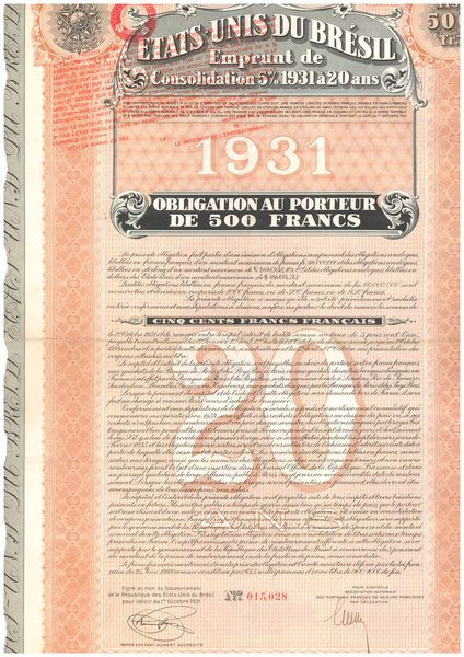 Etats-Unis du Brésil - Emprunt de Consolidation 5 % 1931 à 20 ans (Obl 500 F)